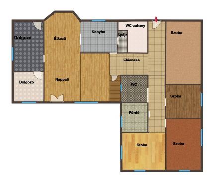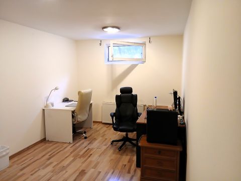 A pinceszinten szobák ,tárolók, fürdőszoba-mosókonyha, kazánház, kétállásos garázs, és közlekedők lettek kialakítva. A földszinti lakószinten előszoba, konyha, két fürdőszoba, WC, kamra, étkező-nappali, két iroda ,három szoba, egy félszoba nyert kialakítást.