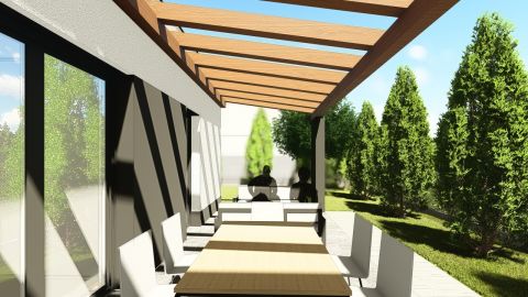 Tervezéskor elsőszámú szempont volt a kényelmes, jól bútorozható, élhető terek kialakítása! Nappalija és konyhája együttesen 43m2 alapterülettel rendelkeznek, amiből közvetlen kijárás biztosított a teraszra és a kertre.