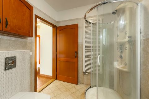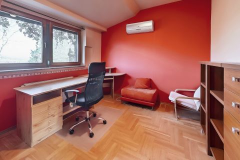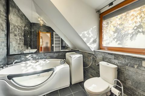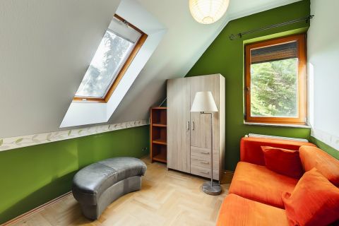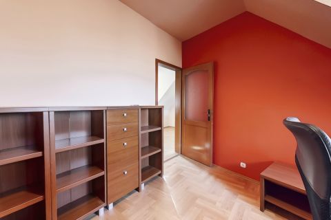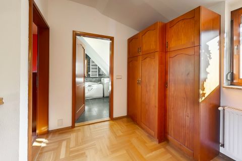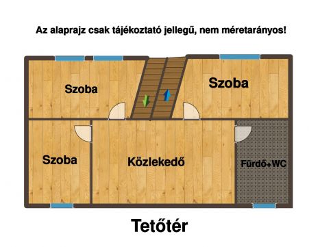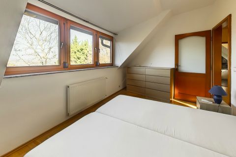 A tetőtérben három hálószoba, közlekedő és egy elegáns fürdőszoba található.