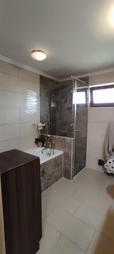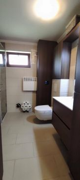 Gyönyörű burkolatokkal ellátott fürdőszobával, WC-vel