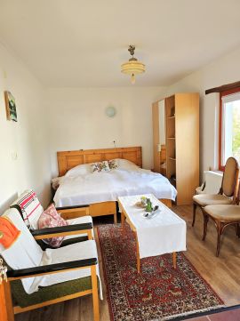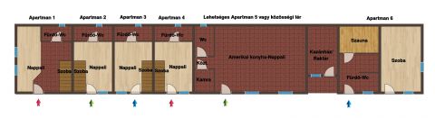 Jelenleg 4 db belső 2 szintes nappali+1 szoba elosztású apartman, egy amerikai konyha nappalis apartman/közösségi tér és egySzaunával rendelkező 1 szintes apartmanból áll a fő épület.