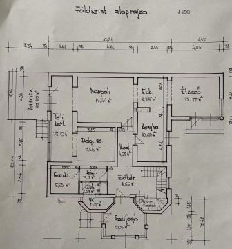 A földszinten: nappali szoba, dolgozó, konyha, két étkező, fürdőszoba, mosdó, hatalmas terasz található