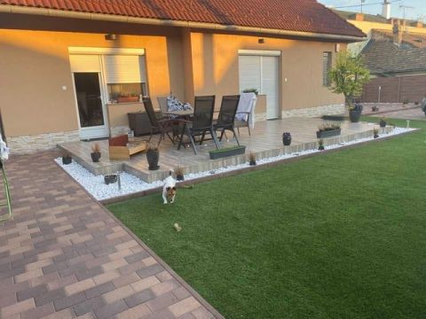 A kert rendezett, gondozott, gyönyörű pázsittal. Az udvaron új kültéri járólap került kialakításra, valamint a kertben található egy praktikus elrendezésű tároló kis házikó is.