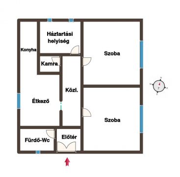 Helyiségek: 2 szoba, étkező, konyha, közlekedő, tároló, fürdő-wc, előszoba, kamra.