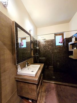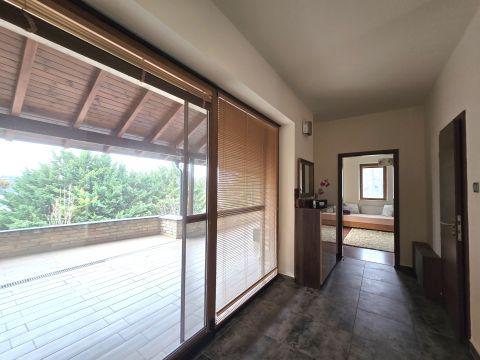 A ház belső térkialakítása harmonikusan illeszkedik a hely domborzatához: az utcaszinten helyezkedik el a konyha étkezővel, vendégszoba a hozzátartozó fürdőszobával és a tágas, nagy belmagasságú nappali, melynek különlegessége, hogy kertkapcsolat helyett egy hatalmas, közel 35 nm-es, gyönyörű panorámával rendelkező fedett terasz tartozik hozzá. Az alsó szint rendelkezik közvetlen kertkapcsolattal, az itt található 3 hálószoba mindegyikéből kijuthatunk a medencéhez, dísztóhoz.