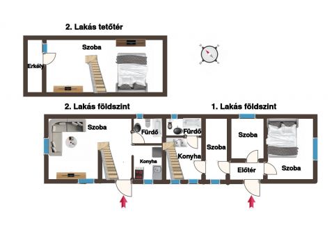 Ház: 2 külön lakrészből és összesen 5 szobából áll