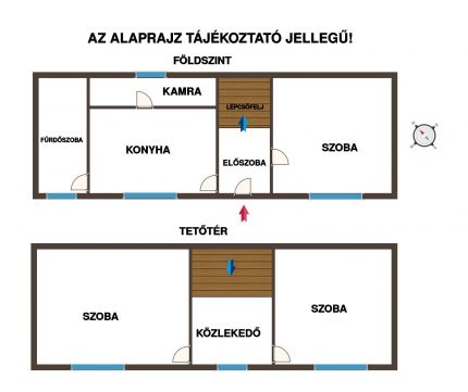 Az ingatlan netto hasznos alapterülete 98 négyzetméter, amely elegendő helyet biztosít egy család számára. Az alsó szinten egy szoba, előszoba, lépcsőfeljáró, konyha, kamra és egy fürdőszoba található, amelyek mindegyike a mindennapi élet kényelmét szolgálja. A tetőtérben két tágas szoba és egy közlekedő került kialakításra, így a ház minden szintje funkcionálisan kihasználható.