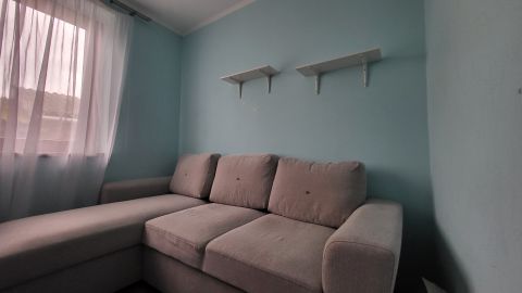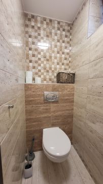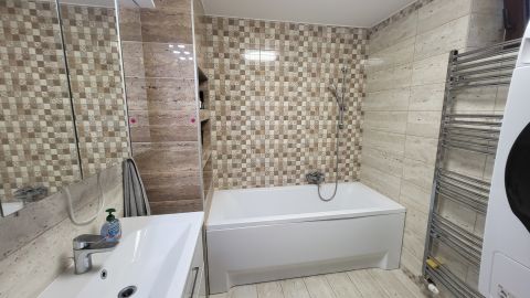 A fürdőszoba és a WC külön helyiségben kapott helyet, a fürdőszobában fürdőkád és törölközőszárító is megtalálható. A lakótér része egy 2,5 m²-es kamra is, amely praktikus tárolási lehetőséget biztosít.
