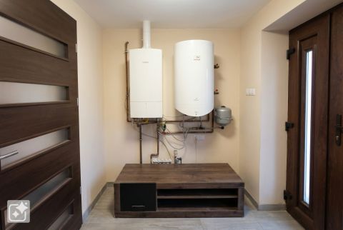 A kényelmet minden helyiségben kiépített padlófűtés biztosítja, amelyhez a meleg vizet gázkazán szolgáltatja. A nappaliban hűtő-fűtő klíma is rendelkezésre áll, amely tovább növeli a komfortérzetet.