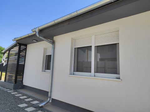 Az épület 2021-ben épült 30-as Porotherm téglából, 15cm-es külső hőszigeteléssel, 3rétegü, 6 légkamrás nyilászárókal, aluminium redőnyökkel.