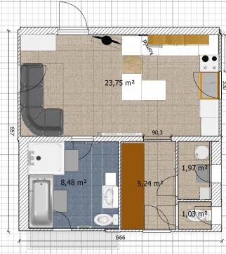 Földszint: Amerikai konyhás nappali és konyha, Fürdőszoba Wc-vel , mely káddal és zuhanykabinnal is rendelkezik. Továbbá előtér a lépcsőfeljáróval, háztartási helyiség és külön Wc.