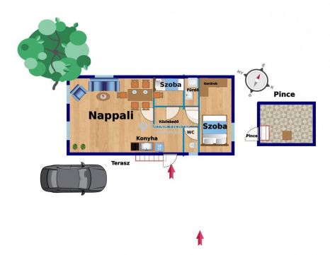 Az épület egy nagyobb nappalival, két hálóval, fürdőszobával, konyhával, vízzel és villannyal ellátott. A ház folyamatos felújítás alatt futott, most fejezték be, előzőleg is albérlők laktak is benne. Új vezetékrendszert, új padlót, új fürdőt kapott.  Az otthon hűtése-melege a beszerelt új klíma teljesítményével biztosítva. Az épület mellett egy régi működő pince található. A pincéből szabályozható a lakás vízellátása. A ház és a közvetlen hozzátartozó telekrész körbe lett kerítve, így a nagy terület ellenére privátszférát kapott.  A telek hátsó része parlagon, bár számos területen hasznosítható. A környékben barátságos, segítőkész szomszédok laknak.