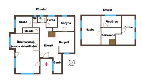Az utcafronti főépület kétszintes, SZIGETELT melyben jelenleg nappali+3 szobás(+2 szoba kialakítása lehetséges), duplafürdős elrendezésű, melyhez hozzá csatolható még egy 30 m2-es helyiség, ami további szobák kialakítására ad lehetőséget.