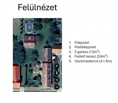 Telek: több mint 5000 m², gondozott kerttel, gyümölcsfákkal, rózsákkal, fúrt kúttal, borospincével és tyúkóllal. A telken 3 garázs, valamint egy 8×4 m-es medence fedett terasszal található. A telek hátsó, magasabban fekvő része további lehetőségeket kínál.