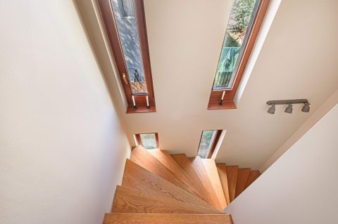 A földszint a fényről és a tágas terekről szól, ahol a külső és belső tér tökéletes harmóniát alkot. A déli tájolású, 3 éve felújított, 42 nm-es terasz közvetlenül kapcsolódik a nappalihoz, a konyhához és az étkezőhöz. Ezek a terek hatalmas üvegfelületekkel rendelkeznek, biztosítva a panoráma élvezetét a házon belülről is. A hidegebb napokon a kandalló melege és hangulata teszi még otthonosabbá a teret. Az emeleti lakóterekkel összhangban ezen a szinten is figyelembe vették a praktikumot: egy dolgozószoba ,egy kisebb tároló helyiség illetve egy vendég mosdó is helyet kapott, kiegészítve a nappali funkcióit.