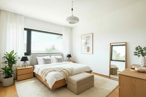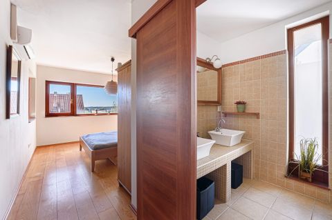 Az emelet a nyugalom és a privát szféra szintje. Itt található 3 nagyméretű hálószoba, melyek mindegyikéből elvehetetlen panoráma nyílik a környező tájra. Az egyik hálószoba akár elkülöníthető lakosztályként is funkcionálhat, saját fürdőszobájának köszönhetően, így maximális kényelmet és intimitást biztosít. A szinten ezen felül még egy tágas fürdőszoba és egy praktikus gardrób helyiség is rendelkezésre áll.