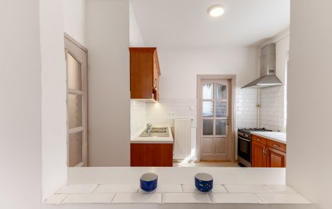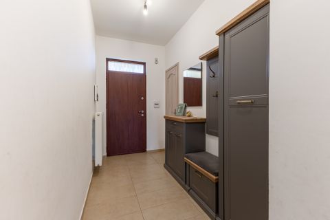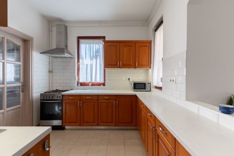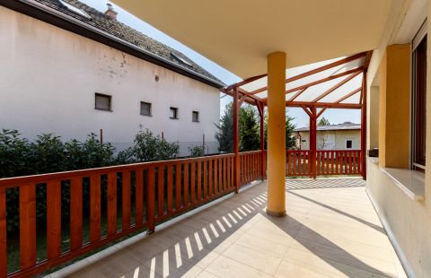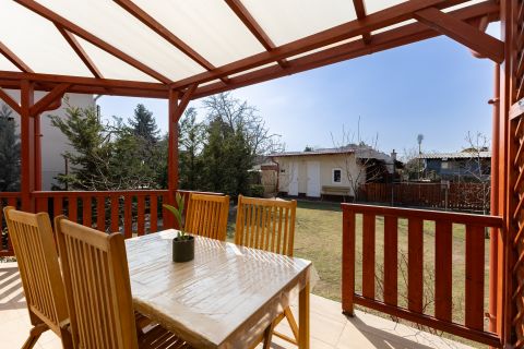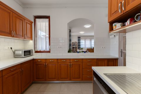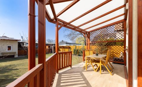 Az egyedileg méretre készült konyhabútor beépített gépészettel a vételár részét képezi. A nappaliból érhető el a hangulatos 31nm-es fedett terasz, mely tökéletes helyszíne lehet a családi rendezvényeknek. A kert hátsó része teljesen intim, az utcáról és a szomszédos telkekről nem belátható, gondozott, babérmeggy, és több gyümölcsfa és egy 23 nm-es kerti tároló is megtalálható.