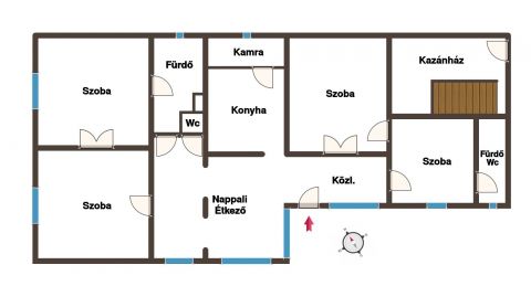 Helyiségei: nappali-étkező, 4 szoba (egyik saját fürdő-wc-vel), konyha, kamra, fürdő, wc, közlekedő, kazánház.