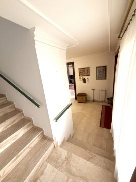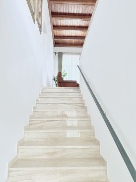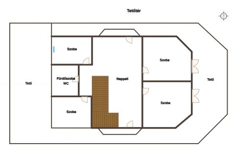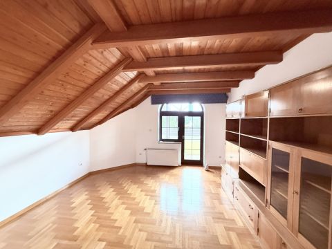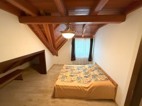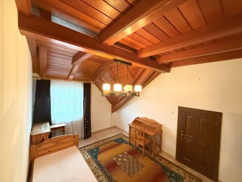 A tetőtérben 4 háló nyílik a hatalmas nappaliból, valamint egy fürdő és WC. Itt a fókuszpont a tető látszógerendázata és faburkolata, A fa ajtók , ablakok és a márvány padló igényes kivitelezése vonzza a tekintetet. Az emeleten egy fedett terasz és két erkély is található.