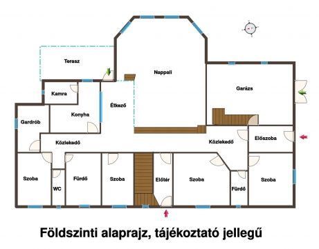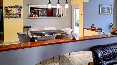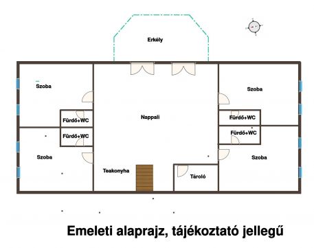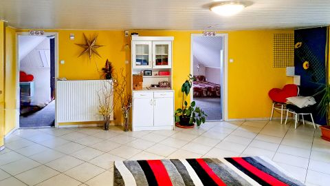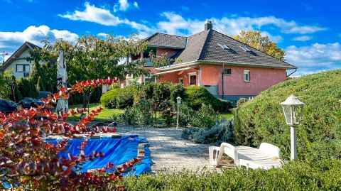 A családi házban egy hatalmas, világos, süllyesztett nappali található, amely közvetlen kapcsolattal rendelkezik, saját terasszal és a gondozott kerttel. Ezen kívül a földszinten megtalálható egy tágas, nagy kiadóablakos étkező és konyha, négy hálószoba, egy gardróbszoba, valamint két fürdőszoba, amelyek közül az egyik zuhanyzós WC-vel, a másik pedig kádas és zuhanyzós, külön WC-vel van felszerelve. Az emeleti részen négy db egyforma apartman áll rendelkezésre, mindegyik saját fürdőszobával, WC-vel, külön közös nappalival, konyhasarokkal és egy nagy erkéllyel. Az emelet teljes berendezése is a vásárlás részét képezi, így az ingatlan azonnal kiadható vagy turisztikai célra is hasznosítható. A pinceszint tárolóként, pinceként funkcionál, de lehetőség van wellnessrészleg vagy további szobák kialakítására is.