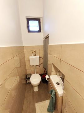 Az előszobából nyílik a fürdőszoba (meleg vizet biztosító villanybojler) és külön WC kézmosóval.