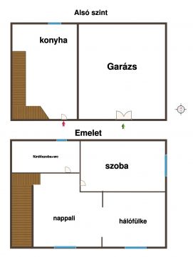 Alsó szinten konyha, az emeleten nappali + 2 szoba