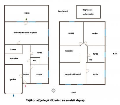 Földszinten: garázs, szoba, amerikai konyhás nappali, fürdő, kamra, közlekedő, wc