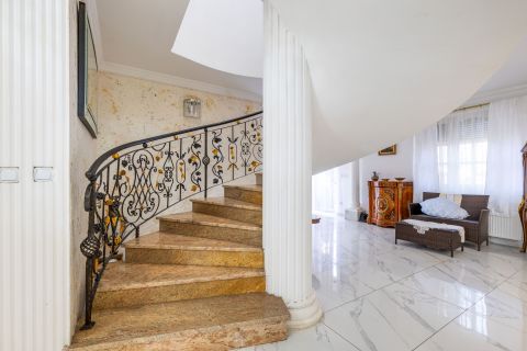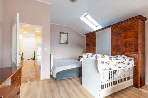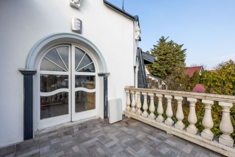 Budakalász - Szentistvántelep kedvelt, igényes, újszerű házakkal tűzdelt részén, csendes kis utcában, eladó egy belső 2 szintes, 6 szobás, 4 fürdőszobás, több erkélyes, egyedi tervezésű, 300 nm-es ház, parkosított, optimális méretű, 562 nm-es telekkel, fedett, 2 autónak alkalmas beállóval.