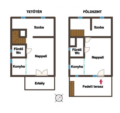 Helyiségei: Földszinten: nappali-konyha, szoba, fürdő-wc, fedett terasz. Emeleten nappali-konyha, szoba, fürdő-wc, erkély.