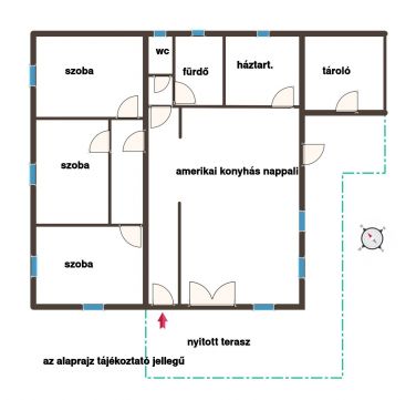 Az elosztás a következő: előtér (10,8 m²), fürdő (6,48 m²), WC (1,76 m²), gardrób (9,14 m²), háztartási helyiség (7,76 m²), közlekedő (1,21 m²), amerikai konyhás nappali (35,7 m²), három szoba (12 m², 12,39 m², 10,26 m²), további WC (1,76 m²) egy nyitott terasz (21 m²).