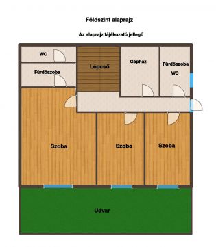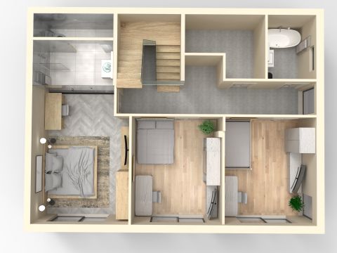 alsó szint: 3 tágas hálószoba, ebből a szülői saját fürdővel