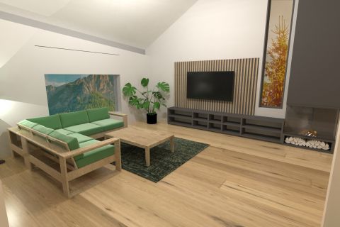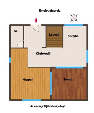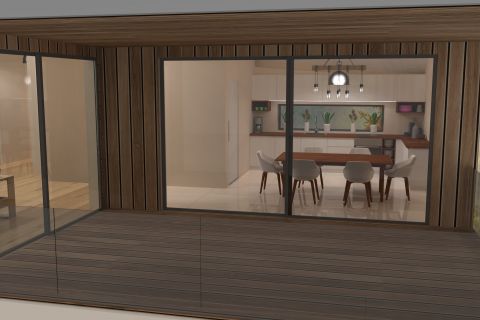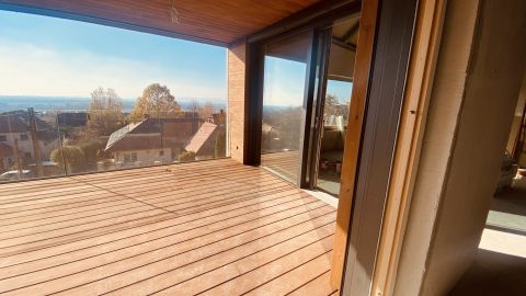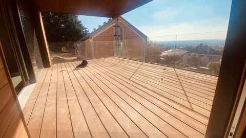 emelet: panorámás nappali, étkező-konyha közvetlen teraszkapcsolattal, fa burkolatú terasszal