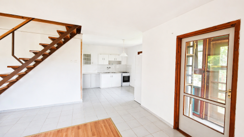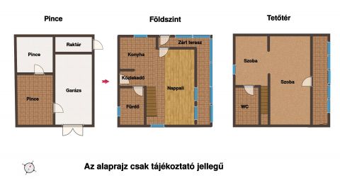 Földszinten nappali + étkezős konyha egy légtérben, fürdőszoba