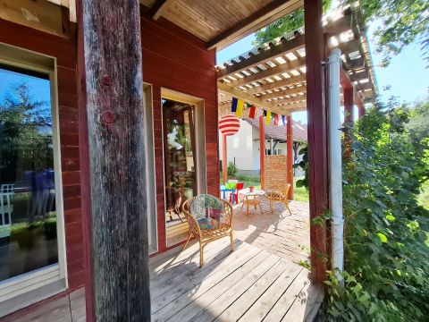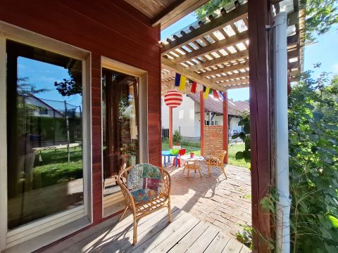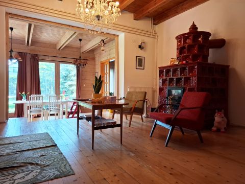 A földszinten egy tágas, világos nappali fogadja, ahol az egyedi cserépkályha melege igazi otthonos légkört teremt. A nappalihoz és a közösségi terekhez teraszok kapcsolódnak, melyek ideális helyszínei lehetnek a reggeli kávézásnak, a nyugodt pihenésnek vagy a baráti összejöveteleknek.