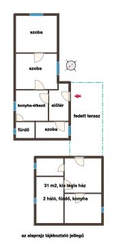 Az 1057 m2-es füvesített telken található egy 1988-ban, téglából épített, 2 szobás ház, valamint egy lakható melléképület, melyek az utóbbi 3 évben nyerték el jelenlegi formájukat: helyet kapott itt egy előtér, konyha-étkező, nappali, szoba és egy félszoba. Mindezeket egy 20 m2-es fedett teraszról tudjuk megközelíteni. A felújítás során új nyílászárók kerültek beépítésre, a szobák laminált padló burkolatot kaptak, újra rakták a cserépkályhát, amely teljesen üzemképes és jól működik. A fűtés egyébként megoldható a konvektorokon keresztül is, de a jelenlegi tulajdonos a klímát használja, melyből kettőt is felszereltek.