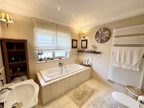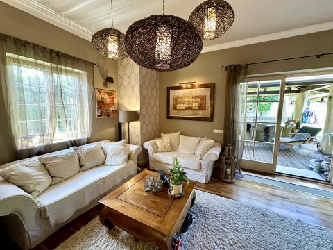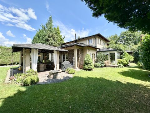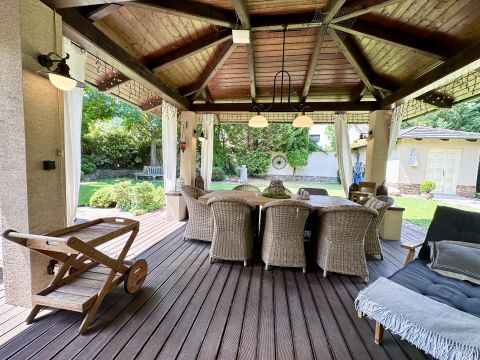 Szentendre központi részén, a Bükkös pataknál, csendes környezetben KIADÓ egy 217 m2 területű, kétszintes, 5 szobás, 3 fürdőszobás, duplagarázzsal ellátott, NAPELEM és Napkollektor rendszerrel kialakított ház, 817 m2, parkosított kerttel.