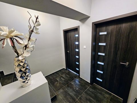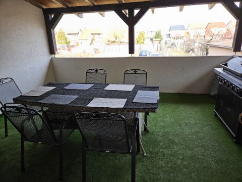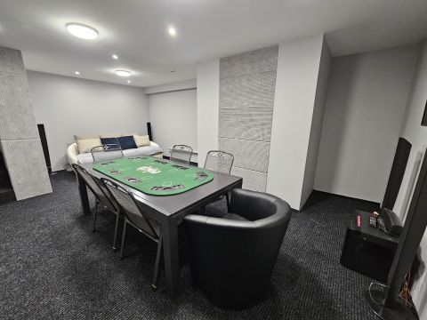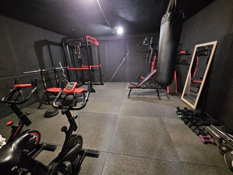 A garázs a képeken látható edzőteremnek lett kialakítva, de bármikor garázsként is tud újra funkcionálni. A baráti összejövetelekre kényelmes klub szoba kapott helyet. Egy 10 nm és egy 27 nm fedett terasz is tartozik az ingatlanhoz.