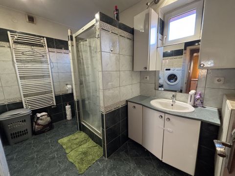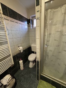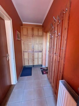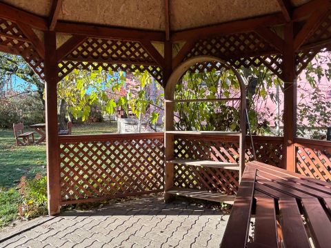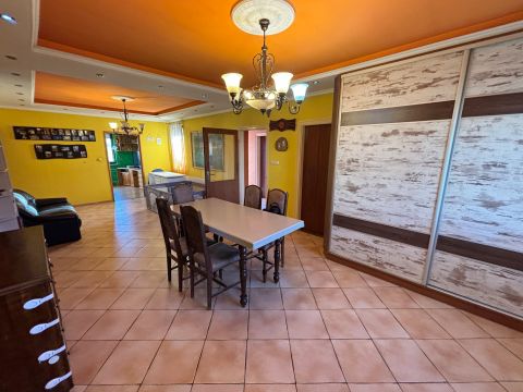 A két épület az 1363 m2 saroktelek adottságaiból adódóan jól elkülönül egymástól, a lakóépületet a szépen parkosított, zöld kerítéssel körbezárt, fákkal tarkított kert határolja el a telek végén elhelyezkedő műhelytől. Az 1991-ben épült családi ház lakótere nettó 115 m2, nagyon jó elosztású. A tágas, amerikai konyhás nappali körül négy hálószoba, egy kényelmes fürdőszoba (káddal, zuhanykabinnal és wc-vel), és egy külön wc is kialakításra került, nagy terasszal a bejáratnál. Az épület teljesen alápincézett (kb.100 m2), beton födémmel készült, tetőtere igény esetén beépíthető, betoncserép héjazattal fedett. A tégla szerkezetű ház 10 cm homlokzati szigetelést kapott 2012-ben. A fűtést vagy a vegyes tüzelésű-, vagy a gázkazán, a meleg vizet villanybojler biztosítja. Az ingatlan lakható állapotú, műszaki korszerűsítése, esztétikai felújítása azonban már időszerű.