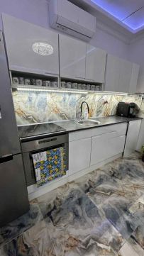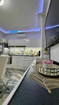 A lakótér praktikus elrendezésű: a 12 nm-es fedett teraszról jutunk be az előtérbe, innen nyílik a külön WC, egy kisebb szoba, valamint a modern, gépesített konyhabútorral felszerelt étkező.