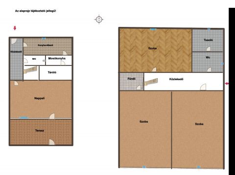 Földszint: Világos nappali nagy teraszkapcsolattal, konyha-étkező, spájz, mosókonyha és WC.