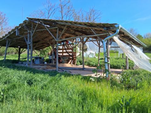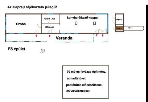 Második telek mérete 6507 m2, amin egy 70 nm-es favázas építmény új nádtetővel, padlófűtés előkészítéssel és vízvezetékkel rendelkezik.
