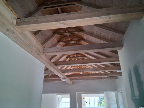Tetőtere beépíthető, jelenleg nyitott belső térrel.