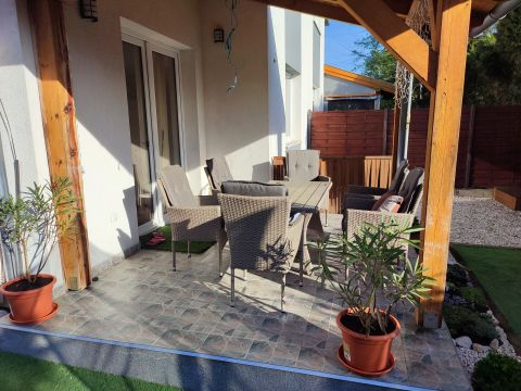 Az ingatlanhoz tartozik egy 250m-es kert, mely prémium minőségű műfűvel borított így igen alacsony fenntartási költséget von maga után. Az udvar méretéből adódóan kiválóan alkalmas baráti és családi összejövetelekre, ahol nyugodtan kihasználhatjuk a környék adta nyugalmat. A szomszédság kedves és csendes, mely elengedhetetlen egy nyugodt Életvitelhez, jó lakóközösség jellemzi a környéket.