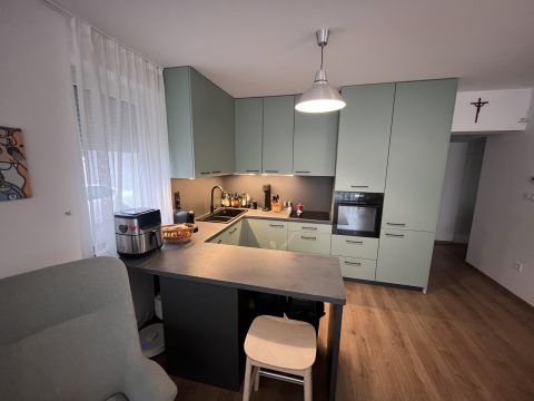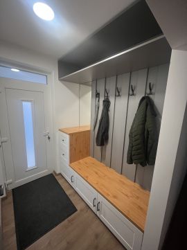 Az egyedileg tervezett konyhabútor teljesen gépesített, továbbá az előszobabútor és a két beépített szekrény is egyedi gyártású.
