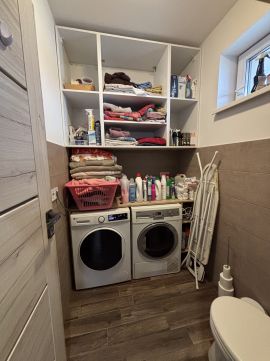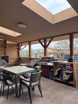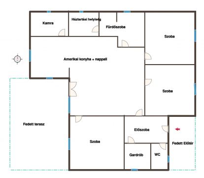 Helyiségei: 3 tágas szoba, amerikai konyha+nappali, kamra, fürdőszoba, háztartási helyiség, gardróbszoba, wc, külön wc+kazánház, előszoba, fedett előtér és egy hatalmas fedett terasz