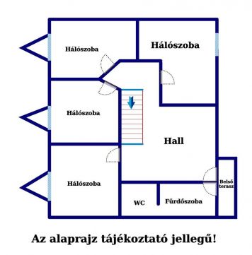 Emelet: négy hálószoba kis teraszokkal, hall, fürdőszoba, külön wc/bidé, belső balkon