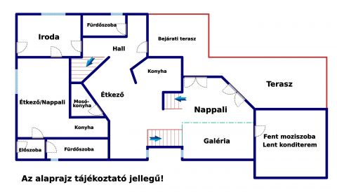 Földszint / eltolt félemelet: hall, wc/zuhany, konyha, étkező nappali, valamint több kiszolgáló helyiség található (konditerem, mosókonyha, spájz), könyvtár, moziszoba.