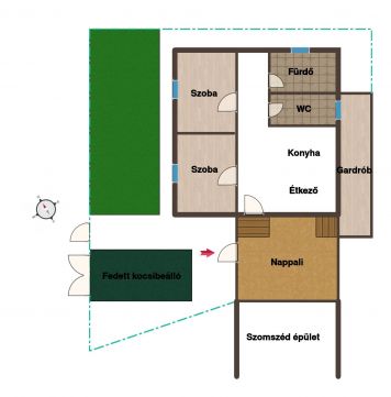 A házhoz saját kert tartozik, az udvar nem közös átjárású, a szomszéddal nincs keresztező forgalom. Az udvarban külön, kívülről megközelíthető tároló található. Parkolás fedett, pergolás kocsibeállóban megoldott, amely elektromos kapun keresztül közelíthető meg, emellett külön személybejáró is rendelkezésre áll.