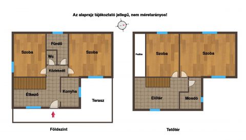 az emeleten szintén 2 szoba, előtér és fürdőszoba WC-vel található.