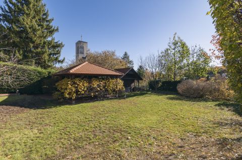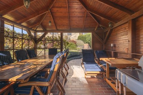 A kert egyik szegletében található nagy létszámú társaság befogadására is alkalmas, gyönyörűen kialakított, természetes anyagokból épült szaletli, fa bútorzattal, sütővel. Mellette egy kisebb, szintén faborítású tároló, a további kerti eszközök igényes tárolására.